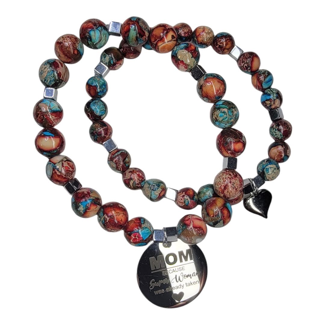 Mother Son Twin Red Blue Jasper Silver Accent Stretchy Bracelet Set
